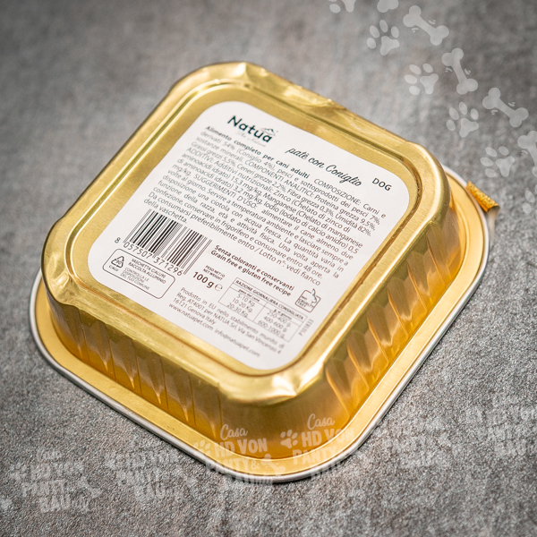 Carni e derivati 54% – di cui Coniglio 4% – Pesci e sottoprodotti dei pesci 7% – Sostanze minerali