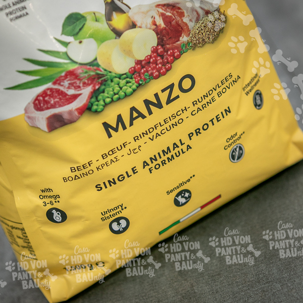 Sostanze minerali – Semi di lino 0.5% – Mirtillo rosso 0.01% – Piselli essiccati – Polpa di cicoria essiccata – Proteine disidratate di manzo 9% – Patata essiccata – Lieviti essiccati – Yucca schidigera 0.1% – Ciccioli di bovino 21% – Proteina di patata – Grasso avicolo – Polpa di mela essiccata 0.5% – Polpa di barbabietola essiccata 2% – Olio di salmone 0.5% – Manzo fresco 26%