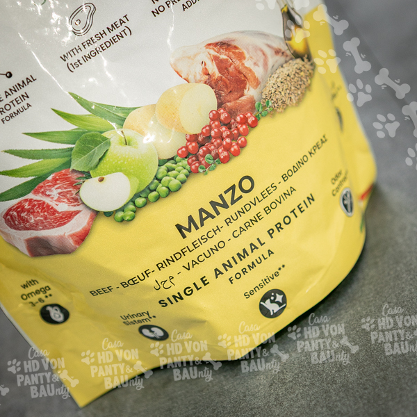 Sostanze minerali – Semi di lino 0.5% – Mirtillo rosso 0.01% – Piselli essiccati – Polpa di cicoria essiccata – Proteine disidratate di manzo 9% – Patata essiccata – Lieviti essiccati – Yucca schidigera 0.1% – Ciccioli di bovino 21% – Proteina di patata – Grasso avicolo – Polpa di mela essiccata 0.5% – Polpa di barbabietola essiccata 2% – Olio di salmone 0.5% – Manzo fresco 26%