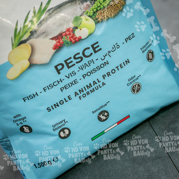 Piselli essiccati – Pesce (trota fresca 26%) – Patata essiccata – Proteine disidratate di pesce (tonno 11%, pesce nordico 10%) – Fibre vegetali di cellulosa – Polpa di barbabietola essiccata 2% – Grasso avicolo – Proteina di patata – Proteine vegetali idrolizzate – Polpa di mela essiccata 0.5% – Lieviti essiccati – Sostanze minerali – Yucca schidigera 0.1% – Mirtillo rosso 0.01% – Semi di lino 0.5%