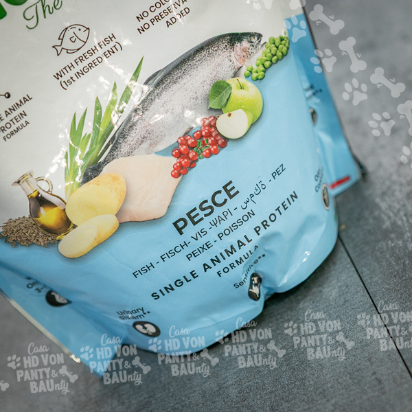 Piselli essiccati – Pesce (trota fresca 26%) – Patata essiccata – Proteine disidratate di pesce (tonno 11%, pesce nordico 10%) – Fibre vegetali di cellulosa – Polpa di barbabietola essiccata 2% – Grasso avicolo – Proteina di patata – Proteine vegetali idrolizzate – Polpa di mela essiccata 0.5% – Lieviti essiccati – Sostanze minerali – Yucca schidigera 0.1% – Mirtillo rosso 0.01% – Semi di lino 0.5%